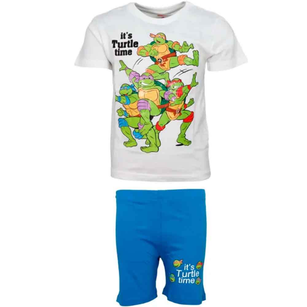 Gør sengetid til et eventyr med denne Ninja Turtles kortærmede pyjamas. Sættet består af en hvid t-shirt med et stort motiv af de fire Ninja Turtles, klar til action, og matchende blå shorts.