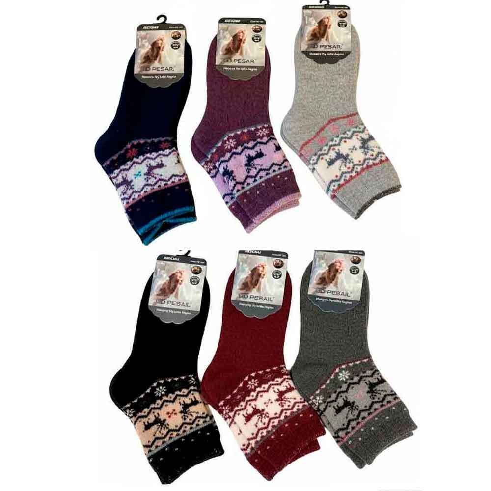 Hold fødderne varme og komfortable hele vinteren med disse bløde angora-uldstrømper i smukt rensdyr- og snefnugmønster.