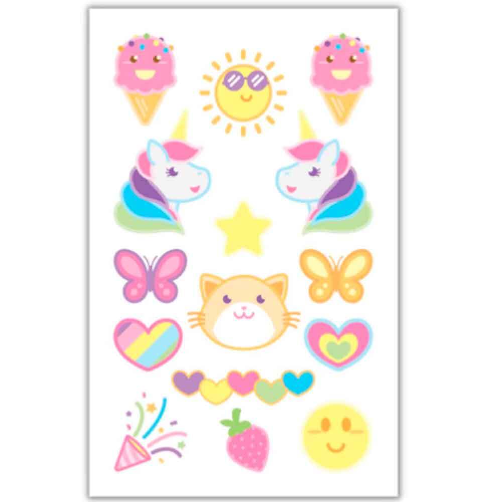 Disse charmerende midlertidige tatoveringer i bløde pastelfarver er den perfekte detalje til at pynte dit barns hud. Arket er fyldt med 15 søde ikoner, der skaber glæde og sætter gang i den kreative leg – fra enhjørninger og hjerter til sommerfugle og is. Tatoveringerne er ideelle til børnefødselsdage, temafester eller som en hyggelig overraskelse.