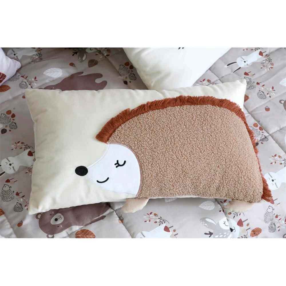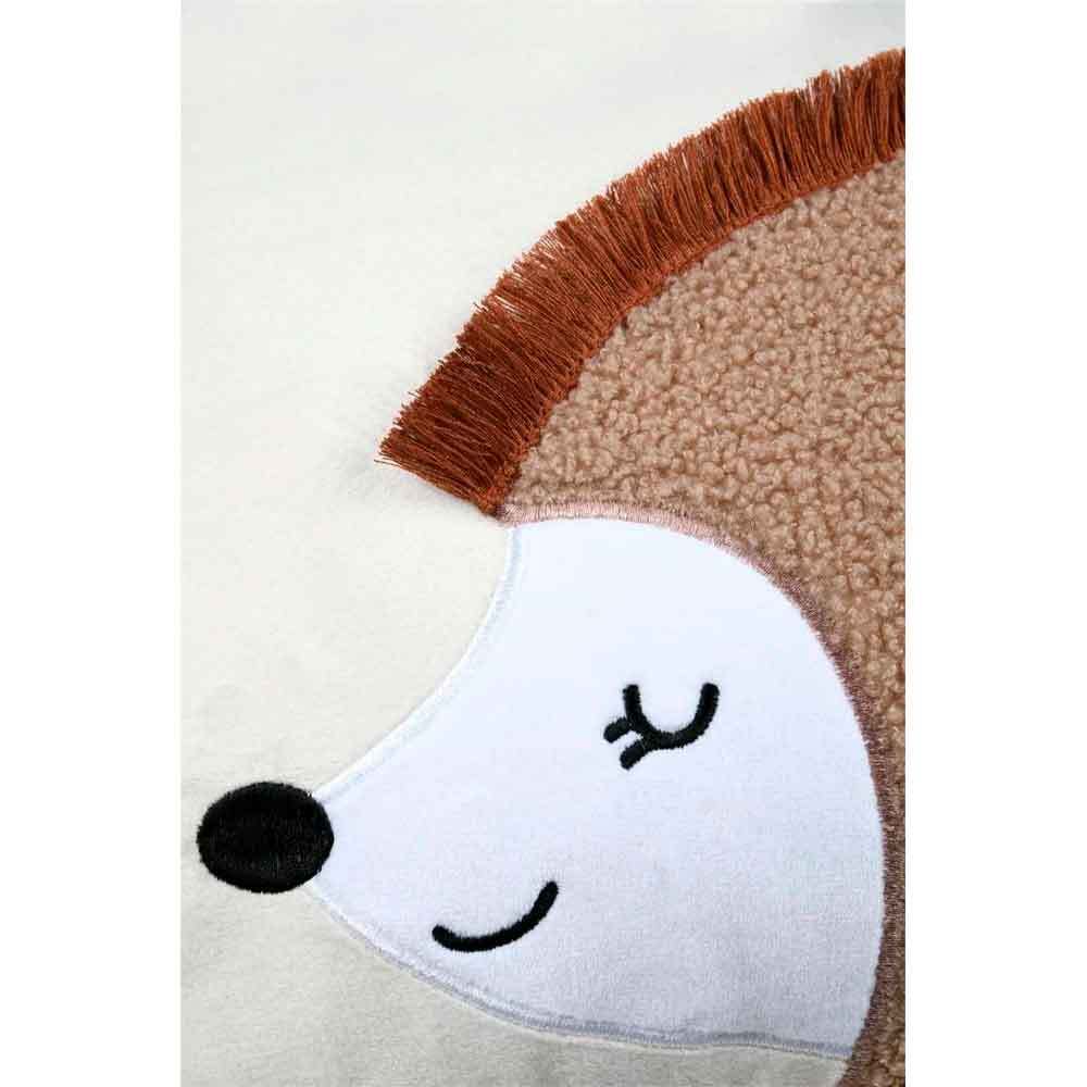 Det søde pindsvinemotiv med blød plysstruktur og små påsyede detaljer giver et legende og varmt udtryk, der passer perfekt til børnesengen eller hyggehjørnet.