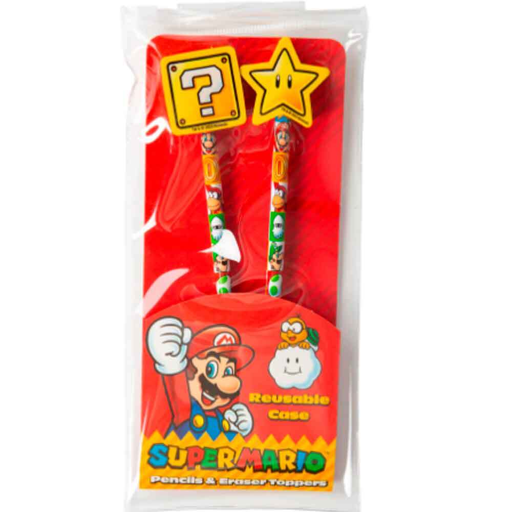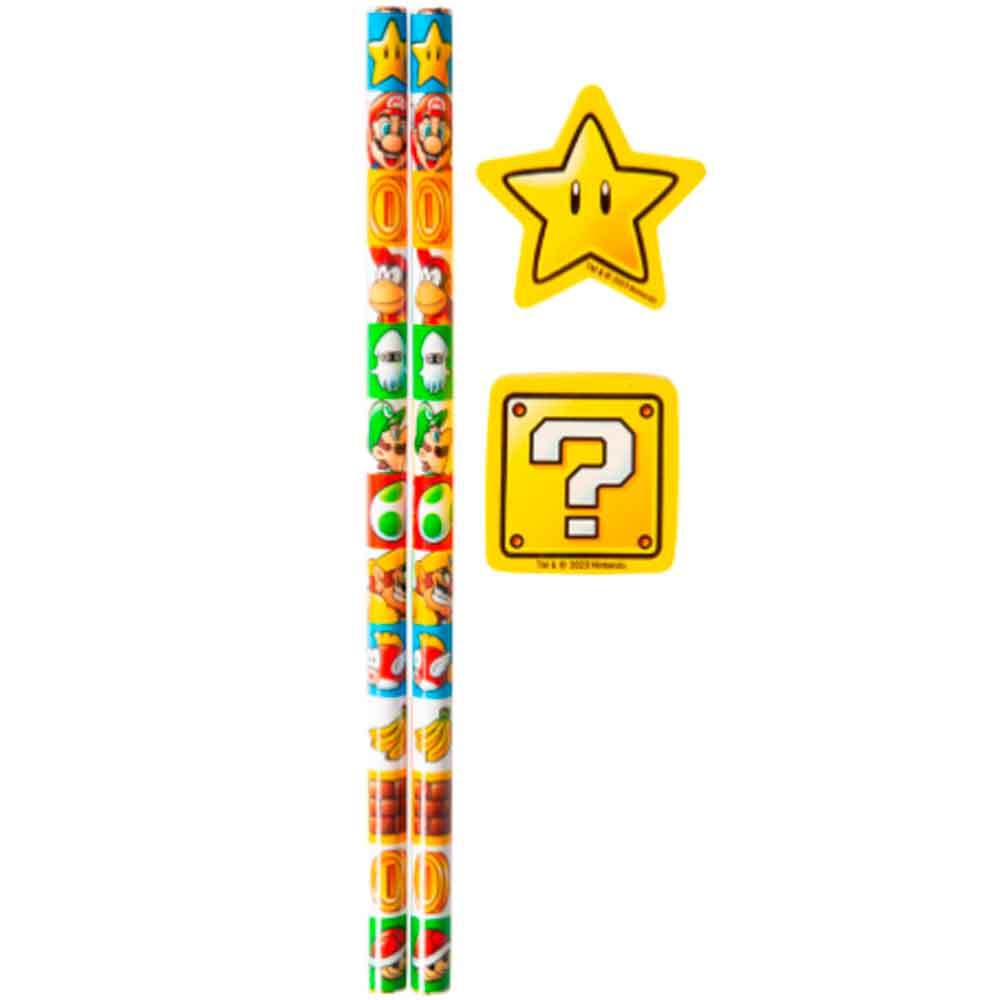 Gør skolearbejdet sjovere med dette Super Mario sæt, der indeholder to farverige blyanter dekoreret med kendte figurer som Mario, Yoshi og grønne svampe. Toppen prydes af to viskelædere formet som Super Star og Mystery Block – perfekte til at kombinere leg og læring.